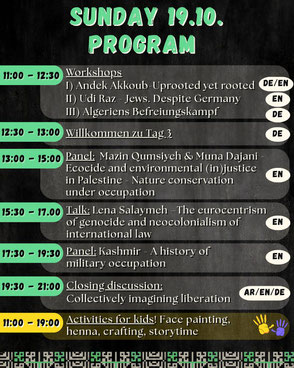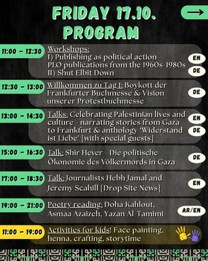 Con un fitto programma di incontri, dibattiti, tavole rotonde, attività laboratoriali, letture ad alta voce, performance musicali e attività per bambini – il tutto in tre lingue (inglese, arabo, tedesco) – il collettivo organizzatore promette di dar vita a uno spazio inclusivo fondato sul dialogo e sulla solidarietà, che abbia come protagoniste proprio quelle voci altrimenti represse e silenziate a causa della loro posizione critica nei confronti di Israele.