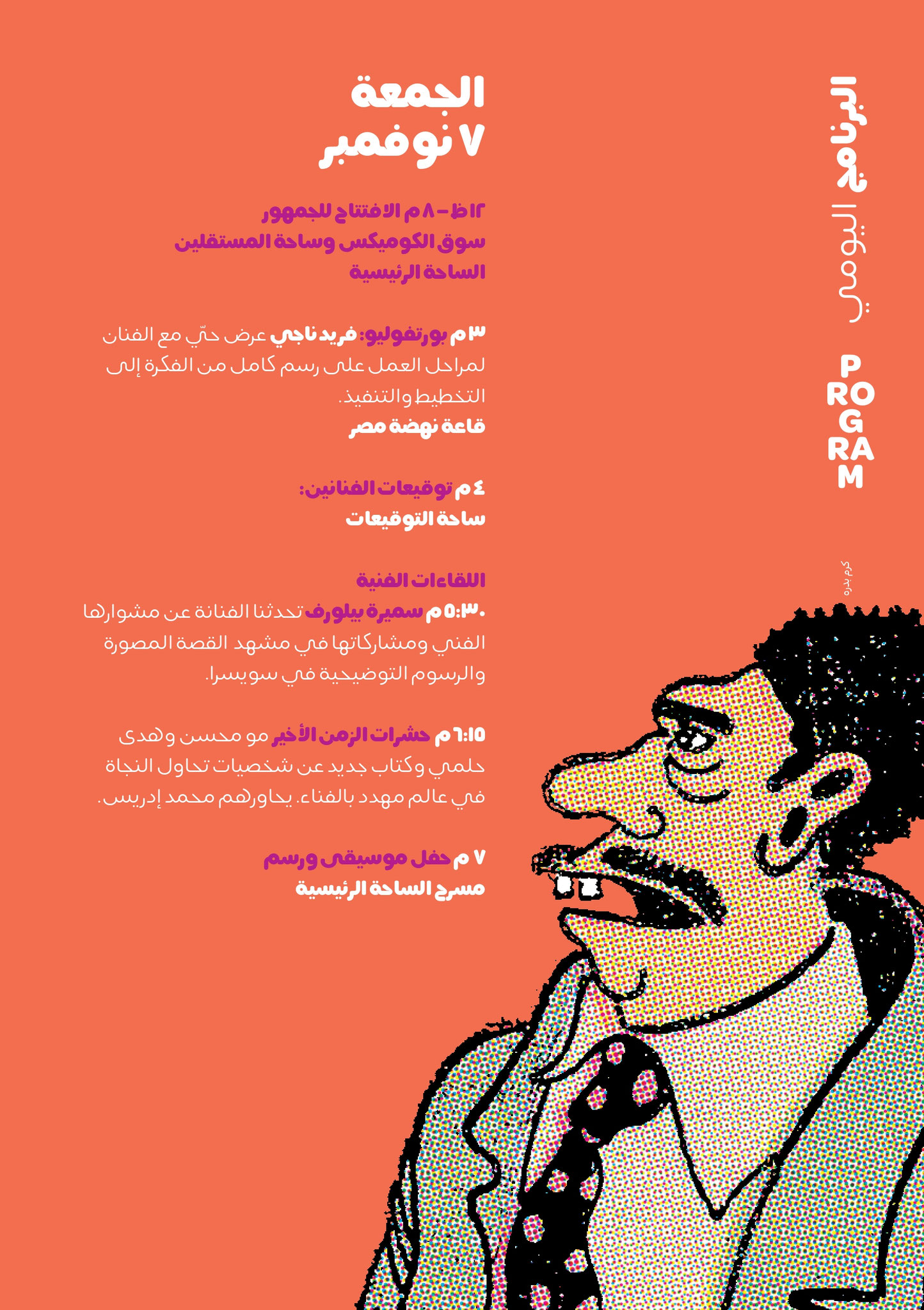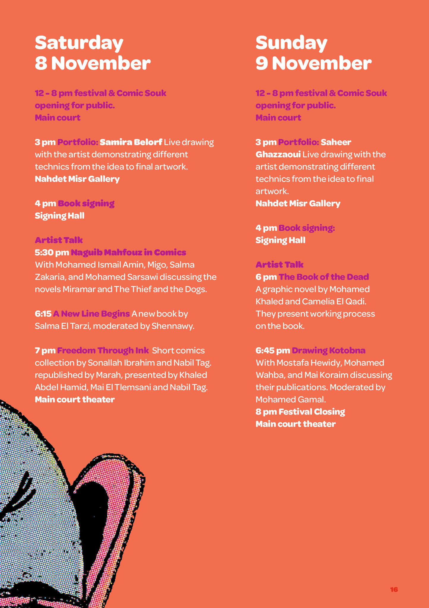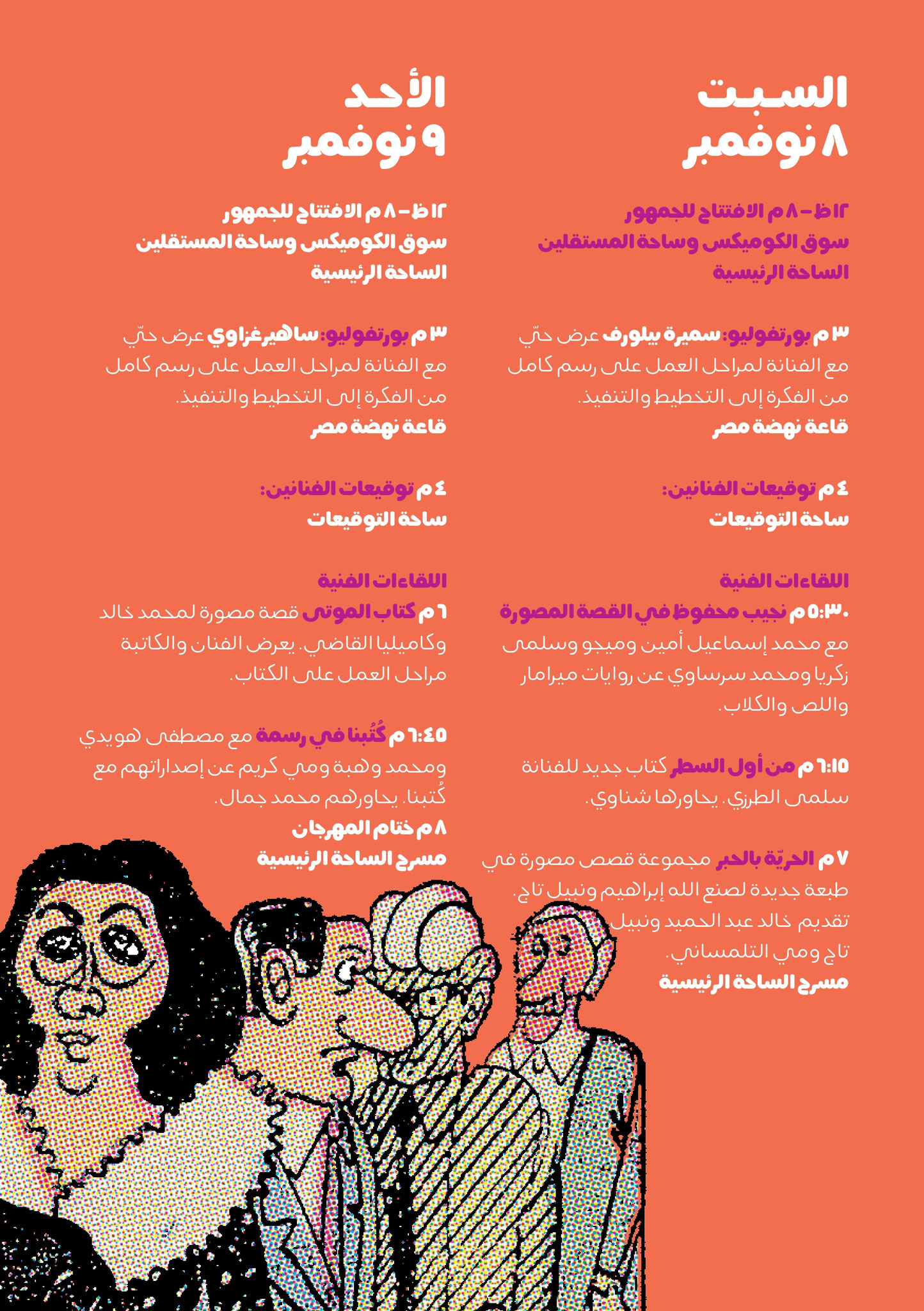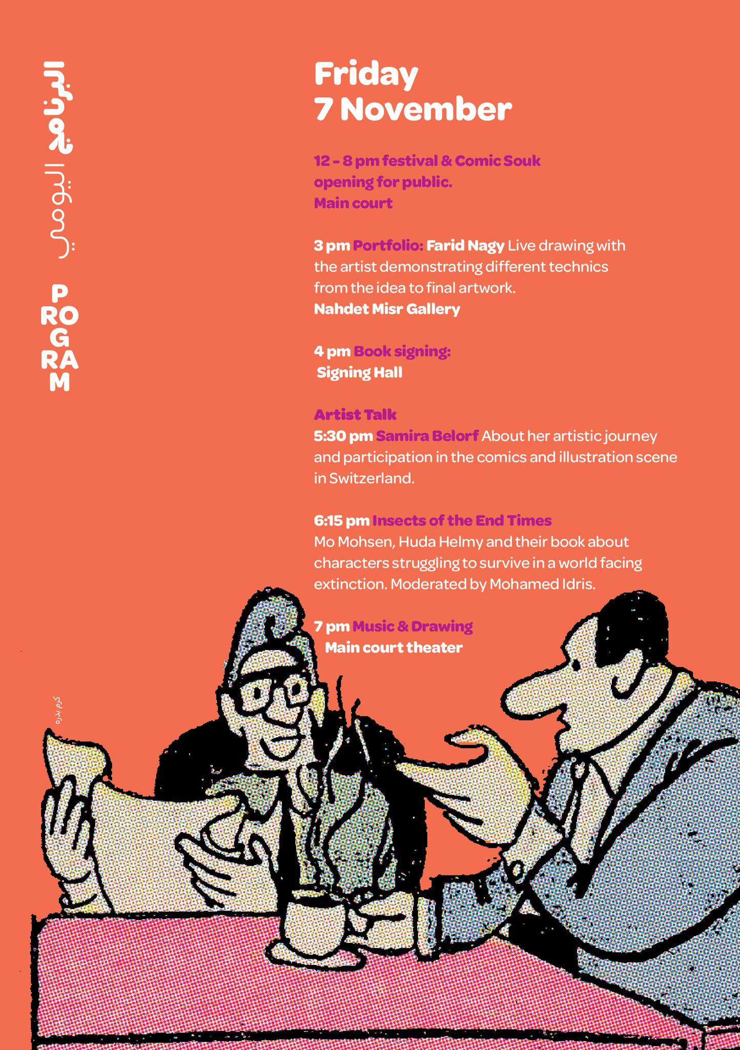 A queste sessioni si aggiungono numerosi incontri con figure di spicco del panorama fumettistico e culturale, tra cui Mohamed Khaled, Camelia El-Kady, Mohamed Ismail Amin, Migo, Salma Zakaria, Mohamed Sersawy, Khaled Abdel Hamid, Nabil Tag e Mai El-Telmisany. Questi momenti di confronto prometteranno di stimolare il dibattito e l'approfondimento sulla cultura del fumetto in Egitto e nel mondo arabo.